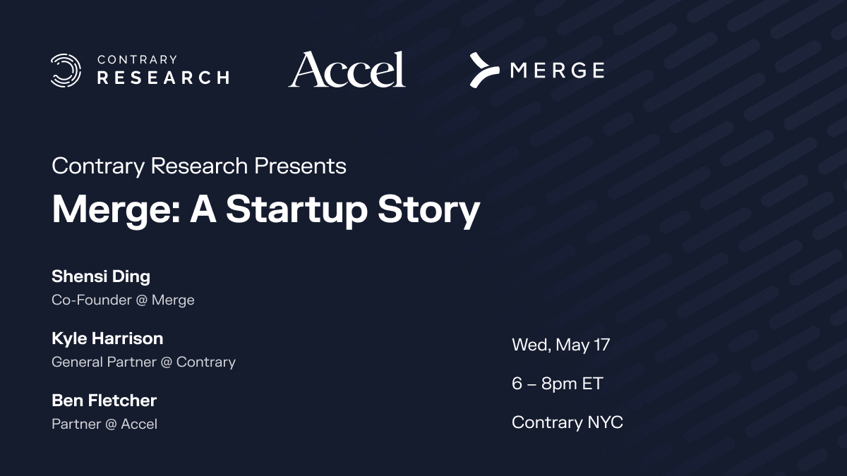 On Wednesday, May 17th we're thrilled to be hosting Merge co-founder Shensi Ding and Accel Partner Ben Fletcher for our latest Research event – a way for us to bring private company stories to life through the lens of the founders themselves. Register here.